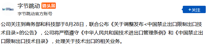 8月30日,字節跳動發布聲明:公司關注到商務部和科技部于8月28日聯合公布的《關于調整發布<中國禁止出口限制出口技術目錄>的公告》,公司將嚴格遵守《中華人民共和國技術進出口管理條例》和《中國禁止出口限制出口技術目錄》,處理關于技術出口的相關業務。