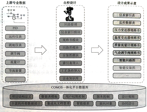 在COMOS軟件平臺中,FEED模塊用于開展前期工藝包設計,隨后工藝包數據可以通過接口傳遞給COMOS P&ID模塊,然后開始進行工程項目的基礎設計?;A設計開始以后,以項目的P&ID圖作為工程設計的源頭,所建立的設備、管道、儀表等對象及其屬性被其他的專業和后續設計及工廠管理、運營階段反復使用和關聯。P&ID圖完成以后,電氣、自控專業在該平臺建立電氣設備和儀表的位號對象,再使用其中的EI&C模塊進行電儀專業工程設計,自控設計人員在位號對象建好以后,使用COMOS邏輯圖模塊設計控制邏輯圖及DCS機柜等自動控制系統。COMOS軟件平臺結構如圖1所示。