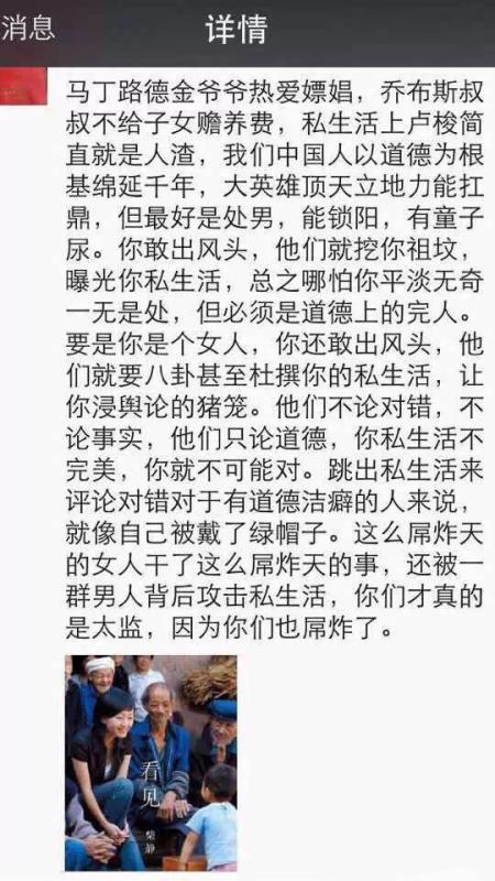 今天上午開始,朋友圈里的風突然開始轉向,柴靜的私生活被扒出來。高齡產婦、抽煙、開大排量車,美國等等關鍵詞充斥。這么用心做的紀錄片,很多評論卻是集中在對柴靜私生活和片子瑕疵的議論上,而不是對霧霾的討論上。那些說片子沒有觸及深層原因的,現在正是你們站出來寫長篇深度探討文章的時候。那些說片子論據有謬的,現在是拿出科學證據讓公眾知情的時候。一個席卷全國的熱點事件,讓嚴肅的環保討論得到了前所未有的高關注度,這樣千載難逢的機會,可以搭順風車做多少有意義的事情啊,而你卻在扒人家的私生活?