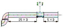 3、若傳感器安裝點的上游有90°彎并沒有或T形接頭,傳感器上游應有不小于20D的等徑直管段,下游應有不小于5D的等徑直管段。