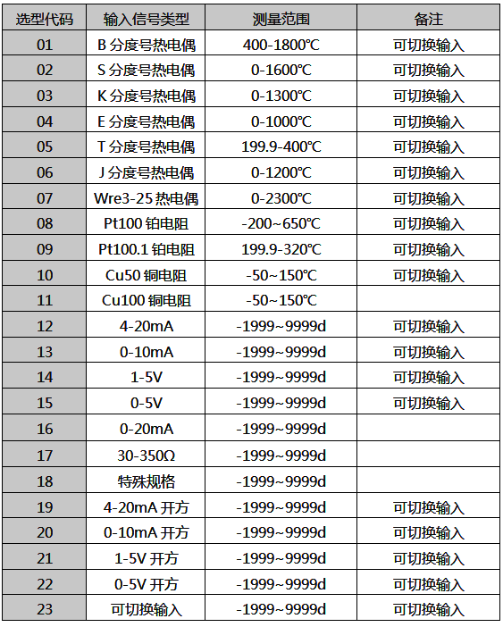 [××]:詳見“儀表輸入類型表”(18種輸入型號類型可自由切換)