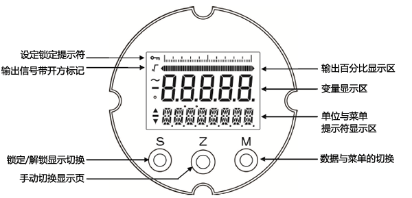 SWP-ST61WT低功耗無線溫度變送器顯示面板有三個按鍵S、Z、M和LCD顯示窗口。