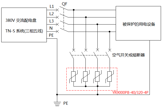 ②TN-S系統,從總配電箱開始就要裝設4P三相交流電源SPD(推薦型號為YR9000PB-40/320-4P)。