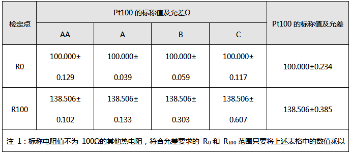 ②Pt100(0℃時電阻值為100的鉑電阻)標稱值及符合允差要求的R0和R100范圍見下表。