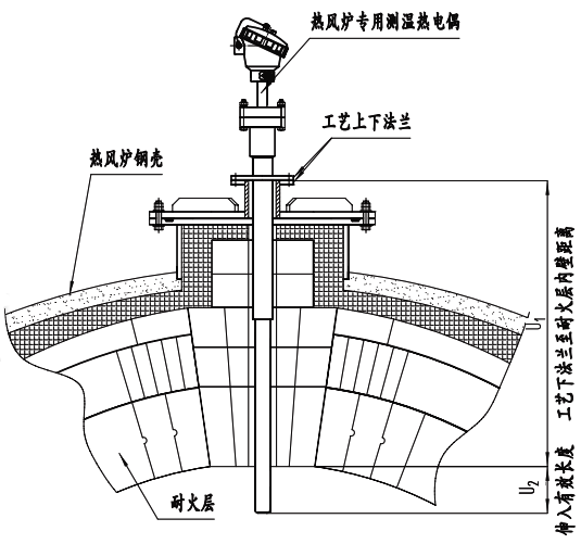注意:上圖U2指熱風爐熱電偶深入熱風爐內的有效長度,這個長度很重要:深入有效長度太長測量的不是燃熱風爐內燒區的平均溫度