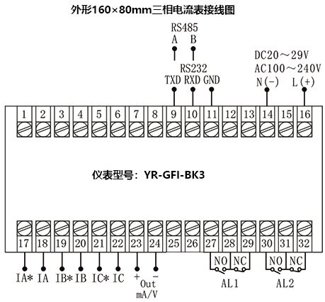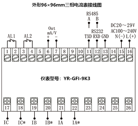 [3M]:120×120mm外形為3路0-20mA變送輸出(RL≤500Ω);其他外形為1路0-20mA變送輸出