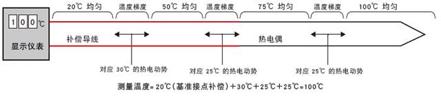 由于感溫部位存在溫度梯度,補償導線上也會產生與該溫度差相當的熱電動勢。熱電偶顯示儀表計算產生的熱電動勢的合計值,并顯示為溫度。