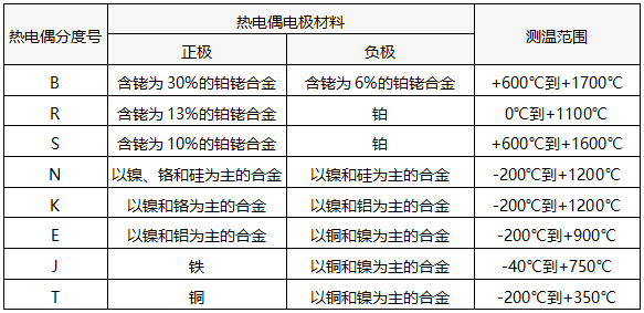 B型熱電偶、R型熱電偶、S型熱電偶被稱為貴金屬熱電偶,而N型熱電偶、K型熱電偶、E型熱電偶、J型熱電偶、T型熱電偶被稱為廉金屬熱電偶。含有鉑、銠等熔點較高金屬的貴金屬熱電偶被用來測量+1000℃以上的溫度,而廉金屬熱電偶則常用于測量+1000℃以下的溫度。