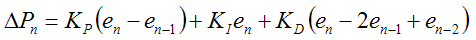 當采集周期T0相對于輸入信號變化周期很小時,可用矩形法來求積分的近似值,用一階的差分來代替微分。經替換最終就可得到離散PID的表達式,離散PID的表達式通常有:位置型,即PID運算控制調節閥的開度;增量型,即PID運算控制調節閥開度的增量(閥位的改變量);速度型,即PID運算控制伺服機的旋轉速度。在計算機控制中增量型算式由于易于實現手動和自動的無擾動切換,比較容易克服積分飽和,得到廣泛的應用,其表達式如下: