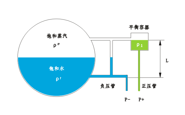 公式中,H為汽包水位高度;ρ1為平衡容器中水的密度;ρ′為汽包飽和水密度、ρ″為汽包內飽和蒸汽的密度;L為汽包上、下連通管間距離。由公式可知,平衡容器結構確定后(即L為已知常數),在汽包壓力維持恒定(ρ′、ρ″確定)以及ρ1一定的條件下,正、負導壓管的差壓輸出△P與汽包水位H呈單值函數關系。因此,若P+、P-接差壓變送器,就可根據所測出的差壓數值知道相應的液位值。