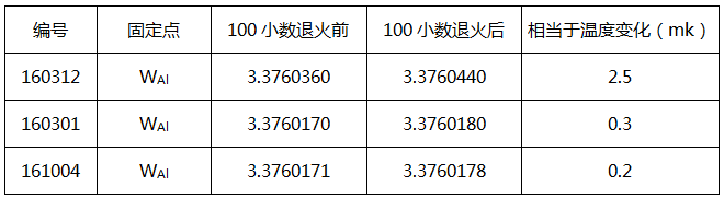 鋁點標準鉑電阻溫度計使用上限為660.323。按ITS-90規定必須經鋁凝固點分度獲得WAl值后,方能計算出鋁點標準鉑電阻溫度計的a7、b7和c7數值。鋁點標準鉑電阻溫度計的WAl值由中國計量科學研究院測定,表3為100小時上限退火前后的WAl值。