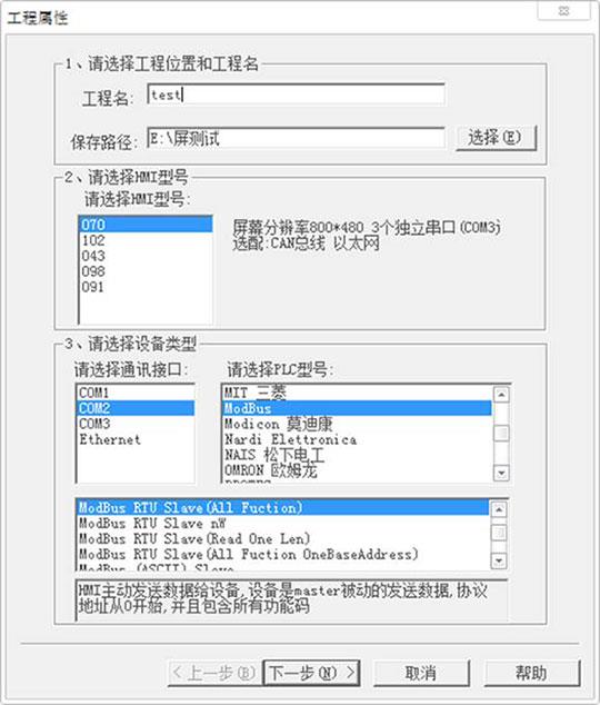 1、新建工程(本例以SWP-HMI人機界面的COM2為通訊口和設備通訊)