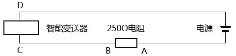 手持通訊器和智能變送器相連接時,可以連在任何位置(如圖所示),可以連在負載電阻R兩端,即AB點;也可以連在CD兩點;但不能連在AD兩點。因為電源是低阻抗的,內阻很小,可以看做是短路,如果連在AD兩點,也即成了電源兩端,由于這兩端的電阻極小,實際上相當于一點,這樣手持通訊器和變送器的HART協議通訊不上就很自然。讀取或設定信息,所以要將連線的連接位置改過來。