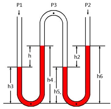 P3-P2=ρ×g×(h6-h5)=ρ×g×h2或P2=P3-ρ×g×(h6-h5)=P3-ρ×g×h2