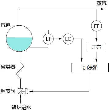 三沖量水位調節系統是在單沖量調節系統和雙沖量調節系統的基礎上又引入了給水流量信號。此時的調節系統利用汽包水位、蒸汽流量、給水流量三個參數進行液位調節。蒸汽流量作為前饋信號;汽包水位為主參數,給水流量為副參數構成串級回路。它是一個前饋-串級調節系統。這種調節系統宜用于大型鍋爐,因為鍋爐容量越大,汽包的相對容水量越小,允許波動的蓄水量就更小。如果給水中斷,可能在很短的時間內就會發生危險;這樣就對汽包水位控制提出更高的要求。鍋爐液位三沖量控制系統的組成形式較多,現分析如下。
