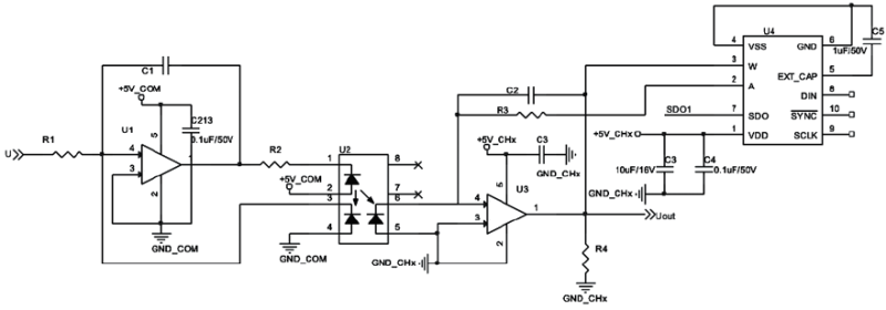在U1和U3運放的選型上,需要選擇噪聲密度小的,并且選擇噪聲對開關增益影響小的運放。同時,為了保證精度,對放大器的+5V供電電源需要控制紋波的幅度,為了降低對紋波的影響,需要對運放的電壓抑制比進行選擇。由于運放的電源電壓的變化會影響輸入差分電壓的偏置點,運放內部結構的匹配性誤差,輸入差分電壓的偏置點的改變會引起輸入失調電壓的改變,同時導致輸出電壓的變化,影響電路的精度。在EDA設計的時候也需要對運放的電源以及旁路電容的布置予以考慮,避免由PCB上引入更多的干擾影響模擬量信號隔離器轉換的精度。