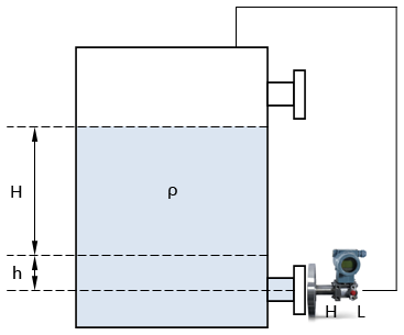 a、在常溫下,如圖3,單法蘭液位變送器的正壓室凸法蘭與容器的低端法蘭相連,將容器的高端法蘭用盲板堵死。在容器頂部做一取壓口,用導壓管與單法蘭液位變送器的負壓室相連。變送器的量柱為:L=H×ρ;零點遷移量為:L0=h×ρ;在最低液位時,作用于變送器的靜壓為:△P0=h×ρ;在最高液位時,作用于單法蘭液位變送器的靜壓為:△P=H×ρ+h×ρ。這些公式中H為最高液位和最低液位的高度差;h為最低液位到變送器低端法蘭中心線的高度;ρ為容器內介質的密度。
