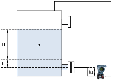 a、在常溫下,如圖5所示,將單法蘭遠傳差壓變送器帶毛細管的法蘭與容器的低端法蘭連接,從容器頂部取一導壓管與變送器負壓室相連。單法蘭差壓變送器的量程為L=H×ρ;零點遷移量為L0=h×ρ+h1×ρ1;在最低液位時,作用于變送器的靜壓為△P=h×ρ+h1×ρ1;在最高液位時,作用于變送器的靜壓為△P=H×ρ+h×ρ+h1×ρ1,公式中的h1為單法蘭差壓變送器正壓室中心線相對容器低端法蘭中心線高度;ρ1為單法蘭差壓變送器毛細管內介質密度。