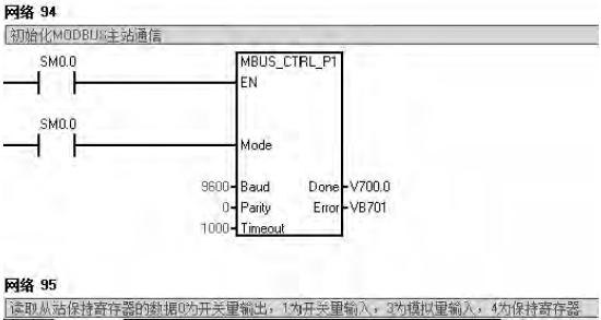 b、在程序調用庫文件“MBUS_CTRL,MBUS_MSG”的時候,設置參數應該重點注意通訊速率,儀表地址,儀表讀取或寫入地址,PLC分配的存儲地址。例如作主站的S7-200的MBUS_MSG指令向Modbus從站發送請求消息,和處理從站返回的響應消息。要讀取從站的I0.0開始的地址區時,它的輸入參數Addr(Modbus地址)為10001。S7-200從站保持寄存器的V區起始地址為VB200時,要讀取從站VW200開始的V存儲區時,保持寄存器的地址是40001。