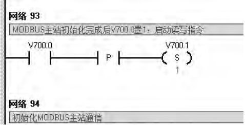 其中,EN-使能:必須保證每一掃描周期都被使能;Mode-模式:常為1,使能Modbus協議功能;Baud-波特率:設置要與從站對應,本例設為9600;Panty-校驗:0為無校驗;Timeout-超時:主站等待從站相應時間,這個值必須足夠大以保證從站有時間響應;Done-完成位:初始化完成,自動置位,可用于啟動MBUS_MSG程序;Er-ror-初始化錯誤。初始化完成后,啟動讀寫指令V700.1。程序如圖6所示。
