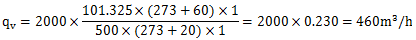 [計算實例2]某空氣流量計設計量程為0-2000m3/h(20℃,101.325kPa狀態下),工作狀態下的壓力為0.5MPa,溫度為60℃,求工作狀態下的體積流量。
