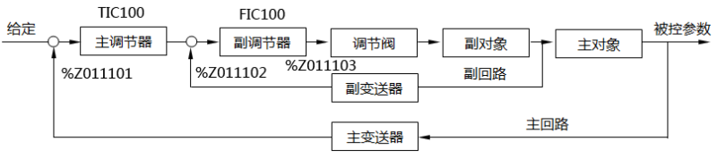 我們把組態圖轉換成常規的控制系統方塊圖,如圖7所示,就很直觀和容易理解了。串級控制系統就是利用兩個串聯在一起PID的調節器,來穩定一個工藝參數。處于外面的是主回路,由主變送器、主調節器、主對象構成閉合回路。處于里面的是副回路,由副變送器、副調節器、調節閥、副對象構成閉合回路。主調節器的輸出作為副調節器的給定值。系統通過副調節器的輸出去控制調節閥的開度,實現對主參數的控制。主、副兩個回路的分工明確,主回路完成“細調”任務,副回路完成“粗調”任務,副回路起到一個超前的作用??梢岳斫鉃椋褐骰芈肥莻€定值控制系統,副回路是個隨動系統,通過以上分析,可以知道,主調節器發出命令,副調節器進行調節,小干擾由副調節器來消除,大干擾副調節器搶先調,余下的主、副一起調。當知道某個回路有故障,對另一個回路會造成什么影響,就可以大致進行分析和判斷。