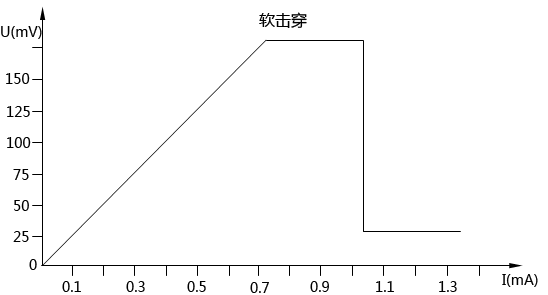 熱電阻溫度元件軟擊穿后,將失去原有的電學特性。熱電阻元件在其正常工作范圍內的任一溫度下應具有普通電阻的基本特性。在熱電阻軟擊穿后,其U、I曲線不再線性,在電流達到一定值時絕緣下降,熱電阻擊穿,阻值下降,阻值與溫度之間不再具有對應關系。熱電阻軟擊穿元件的實際UI特性圖如下圖所示。