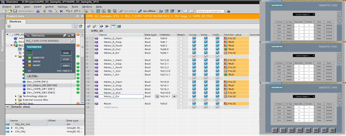 我們引入控制對象的概念,示例中每一個電機就是一個控制對象,每個電機控制對象包括了4個位輸入,2個位輸出,1個背景數據塊,通過控制對象硬件IO表(UDT)將每個控制對象的硬件IO關聯到一起??梢杂幸韵聝煞N定義方式: