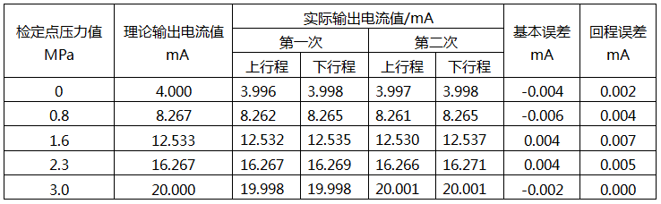 △A=Ad-As公式中△A為壓力變送器各檢定點的測量誤差;Ad為壓力變送器上行程或下行程各檢定點的實際輸出值;As為壓力變送器各檢定點的理論輸出值;以最大一次的測量誤差為該點的基本誤差。