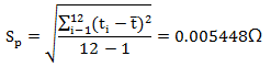 采用B類方法評定。測量被測工業鉑電阻時,用數字多用表歐姆檔進行測量,根據其說明書1000Ω量程誤差為±(50ppm×reading+2ppm×range),取其半區間,服從均勻分布