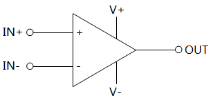 在集成運算放大器的輸入與輸出之間接入不同的反饋網絡,可完成信號放大、信號運算、信號處理、波形的產生和變換等功能。集成運算放大器具有穩定性好、使用方便、成本低等優點,因此得到廣泛的應用。下圖為典型集成運算放大器的圖形符號,并用文字符號U表示。圖中:IN+和IN-表示同相、反向輸入端,OUT表示輸出端,V+和V-表示正、負電源。由于不同的集成運算放大器在電路中會有不同的電路符號,因此在識讀電路圖的時候要注意。