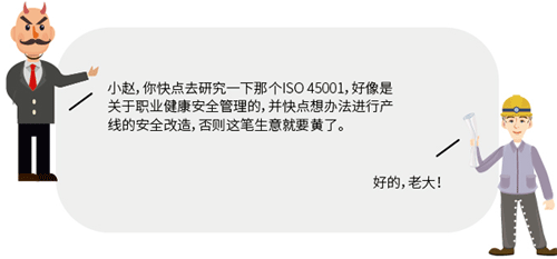 BOSS:小趙,你快點去研究一下那個ISO45001,好像是關于職業健康安全管理的,并快點想辦法進行產線的安全改造,否則這筆生意就要黃了。