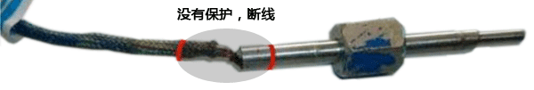 測溫導線耐油、耐腐蝕、耐熱性能比較差;長期在油浸的環境中,容易出現變硬、變脆、外皮開裂等現象,縮短其使用壽命;長期振動會導致導線在傳感器根部斷開見(圖1、圖2)。經現場檢查發現,根部斷線的故障幾乎占了測溫電阻故障總數的50%。