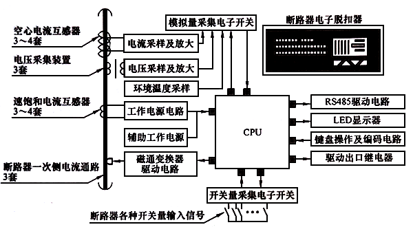 圖3中,電流,電壓等模擬量通過模擬量采集電子開關輸入到CPU中,CPU對模擬量采集電子開關發出選通控制實現高速循環輸入各種模擬量;斷路器的各種開關量則從開關量采集電子開關輸入CPU。CPU的輸出包括:LED顯示器顯示測控信息和模擬量信息,鍵盤操作及編碼電路用于實現人機對話,驅動出口繼電器則用于執行各種脫扣操作,而RS485驅動電路則用于與上位系統交換信息。