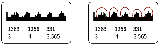 上圖中左圖是原圖,右邊是用線圈出來的。線圈里面是一個個間距差不多的,有規律分布的波峰,這個是比較有代表性的變頻器造成的電磁干擾。這里基線下面的兩行數字都有數值,但是這些數值都是電磁干擾形成,沒有任何意義。