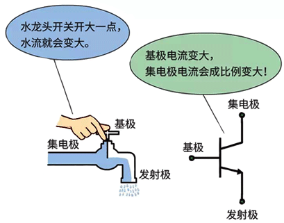 當三極管發射結正偏,集電結反偏,三極管就會進入放大狀態。在放大狀態下,三極管就相當于是一個受控制的水龍頭,水龍頭流出水流的大小受開關(基極)控制,開關擰大一點,流出的水就會大一點。