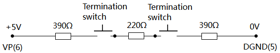 Profibus的連接器上除了有一個220歐姆(Ω)的終端電阻外,還包括一個390歐姆(Ω)的上拉電阻和一個390歐姆(Ω)的下拉電阻。其中,上拉電阻(390Ω)與針腳6(VP,+5V)相連接,下拉電阻(390Ω)與針腳5(GND,0V)相連接,終端電阻(220Ω)通過總線連接器的開關與其它兩個電阻相連,如下圖: