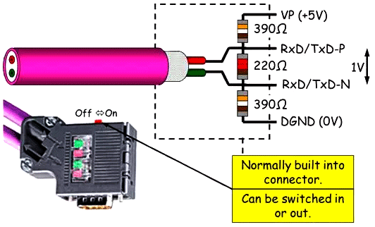 當打開連接器的終端電阻開關(撥到ON檔)后,Profibus的A、B兩條數據線將于220歐姆(Ω)的終端電阻相連,如下圖: