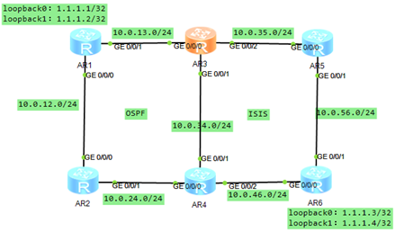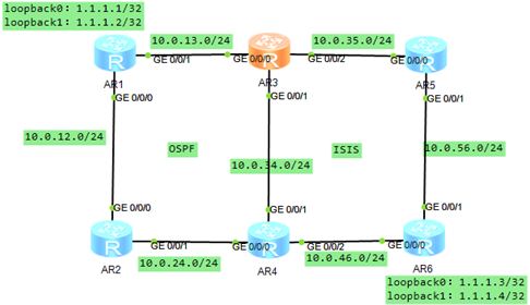 右邊網絡使用ospf協議,左邊使用isis協議,R3和R4連接的鏈路即運行ospf,也運行isis,實現在各自網絡中達到路由互通。