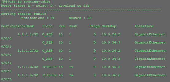 可以看到AR4的路由表中已經存在1.1.1.1/32和1.1.1.2/32的主機路由,說明引入成功。