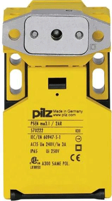 安全開關是安全門的核心元件,常見的安全開關有機械式、感應式等等。本例程使用Pilz機械型安全開關PSENmech3.1,其外觀如下圖所示: