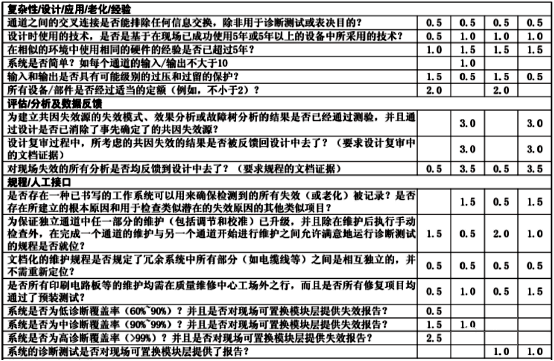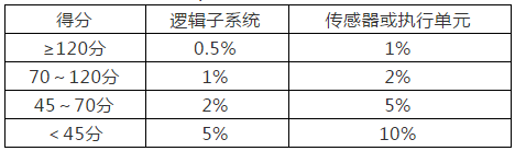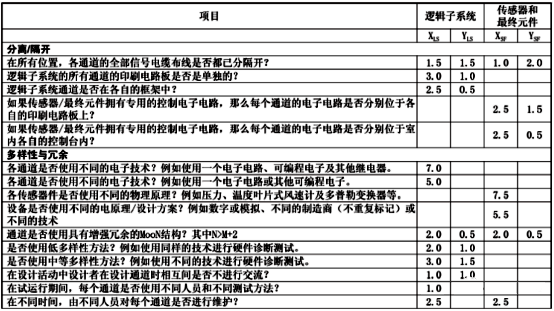 IEC61508-6:2010附錄D中給出了一種用表格打分估算共因失效系數β的方法,通過對傳感器、執行器、安全型控制邏輯器在設計、制作、安裝、維護、使用環境等多方面進行評分。