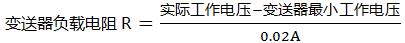 在設計系統時,必須要了解變送器的工作電壓范圍。當變送器的最小工作電壓比較高,又需要帶較大的負載,當24VDC供電變送器無法正常工作時,可以提高工作電壓來解決。總上所述,兩線制變送器的負載能力與變送器實際最小工作電壓有關,其負載電阻計算公式如下: