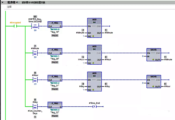 1、首先調用RD_LOC_T讀取日期時間存入到FB塊本地臨時變量中,讀取秒數,根據秒數計算天數