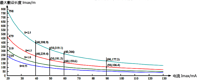 因此,對于上例,考慮線路壓降,查圖8知,電纜最大敷設長度只能為479米。