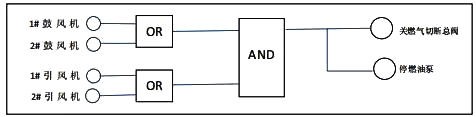 廢液焚燒爐供風系統采用2臺吹風機和2臺引風機,每種機組采用的是一開一備方式,當2臺吹風機或2臺引風機都停運時,應聯鎖停爐,即聯鎖切斷燃氣總閥和供油泵,防止燃氣(油)在爐膛內不能充分燃燒,造成能源浪費。具體聯鎖邏輯如下圖3。