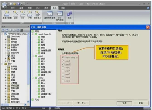 配置PID向導。在工具菜單功能區單擊PID按鈕打開PID回路向導對話框,選擇要組態的回路,最多可組態8個回路,這里我們選擇回路0。