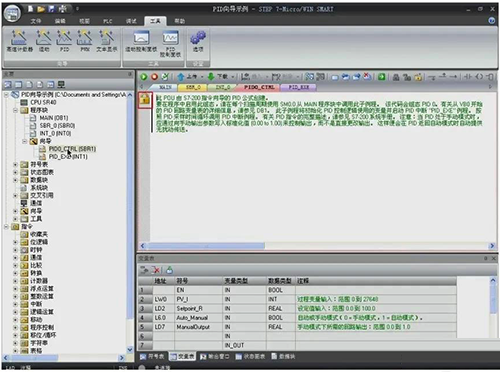 查看向導生成的項目組件。在項目樹中展開程序塊下的向導文件夾,雙擊初始化PID子程序打開,該子程序是加密的,可以查看相關的子程序調用說明,變量表列出了子程序的接口參數定義,編程調用時可參考。雙擊PID功能中斷子程序打開,該中斷子程序也是加密的,請注意PID向導使用了定時中斷0,編程時不能再使用此中斷,否則會引起PID運行錯誤。