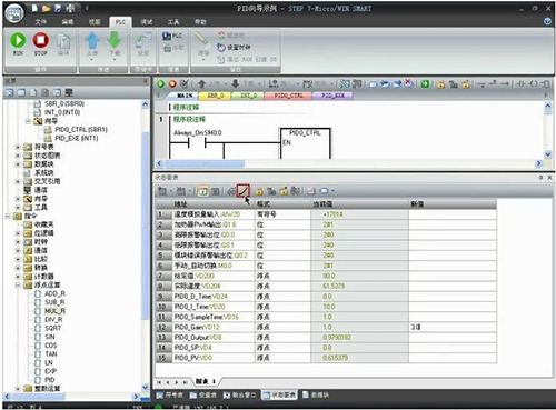 接下來使用西門子S7-200 SMART PID整定控制面板自整定PID參數。首先我們介紹一下PID整定控制面板。左側選擇PID回路號,標定區域顯示給定值、過程值、輸出值以及高低限,均以百分比顯示;圖形顯示區中用不同顏色的曲線顯示了給定值、過程值以及輸出值相對于時間的PID趨勢圖,其中過程值和給定值共用圖形左側的縱軸,輸出使用圖形右側的縱軸;采樣區域中采樣時間是執行PID運算的時間間隔,只能在PID向導配置中更改,速率設置圖形顯示區所有顯示值的采樣更新速率,可以單擊暫停按鈕凍結圖形、單擊清除按鈕清除圖形;調節參數區域中顯示增益、積分、微分參數的當前值,選擇啟用手動調節后在計算值列可以直接修改PID參數,在自動模式下單擊啟動按鈕啟動自整定,自整定完成后單擊更新CPU按鈕將自整定計算出的PID參數寫入到CPU中;狀態區域顯示自整定過程狀態。
