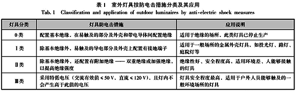①采用Ⅱ類設備或等效的絕緣。對于環境惡劣、不易保證安全的情況下,可以采用Ⅱ類設備或等效的絕緣,此時不應設置PE線,且燈具的可導電部分不應有意地接地。如果布線系統的金屬外層是用絕緣材料和燈具的導電部分隔開,采用Ⅱ類燈具,就可認為已滿足Ⅱ類設備的保護要求。室外燈具按防電擊措施分類見表1。